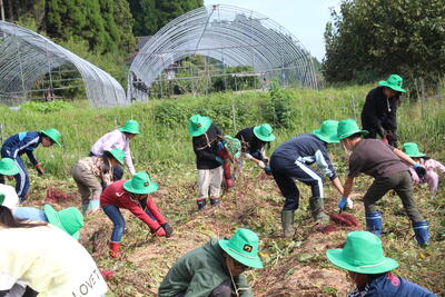 縦割り班ごとに自分たちが植えたところを堀りました。「わぁ、おおきい!!」「こんなところにもあります」「1本にこんなにたくさんのいもがついてる~」など、楽しい芋掘りとなりました。芋掘り前に、みどりの少年団団長が話してくれたように、いろいろな人たちのおかげでこうして収穫できることを実感した子どもたちでした。「やきいもにして食べようかなぁ」「天ぷらにしたらおいしそう」「味噌汁にも入れようかな」など、早くもいろいろな食べ方に想像を膨らませていました。今年は、約500個ほどの大収穫となりました!