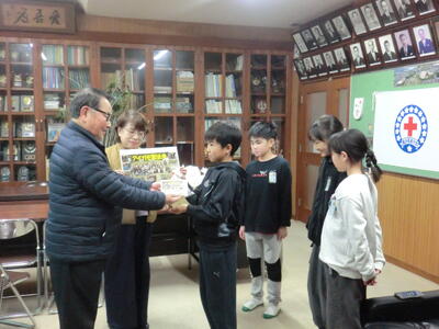 1月9日の昼休みに、校長室で4年生の児童代表4名が、公民館長さんへアイガモ米を贈呈しました。このアイガモ米は、児童が学習の一環として育ててきたものです。贈られたアイガモ米は、こども食堂や地域の高齢者の方のお弁当のお米として活用されるそうです。丹精込めて育てたお米が、地域の方々のお役に立てることを聞き、4年生の子供たちも喜んでいました。