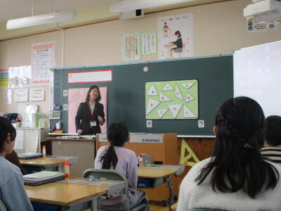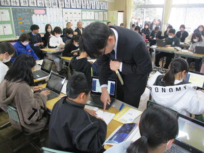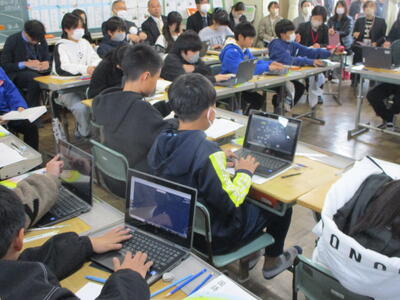 1月23日(木)の2校時に、人吉・球磨地域の初任の先生方が集まり、3年2組のクラスで、「封筒の中の三角形と同じ仲間の三角形を見破って、集めよう!」というめあてのもと、授業が行われました。