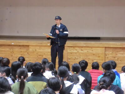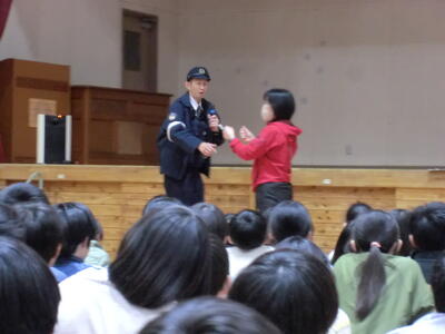 駐在所の中村さんからは、不審な人に遭遇した場合の対処法について、具体的なお話がありました。「不審な人に話しかけられたら、勇気をだして『嫌です。駄目です。ついていきません。』と言ってきっぱりと断り、その場からすぐに逃げる」といった大切なことを教えていただきました。