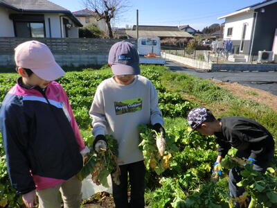 1月30日(木)の5・6校時、3・4年生が総合的な学習の時間の一環として、学校の畑で育てた大根の収穫を行いました。