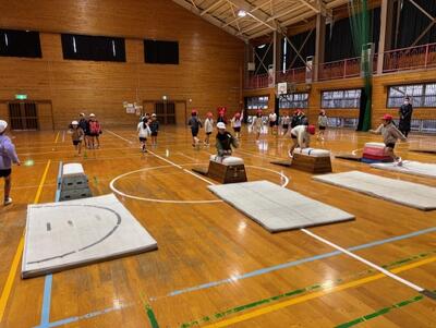 体育館には、様々な練習場所が用意され、2年生が跳び箱の学習に取り組んでいます。