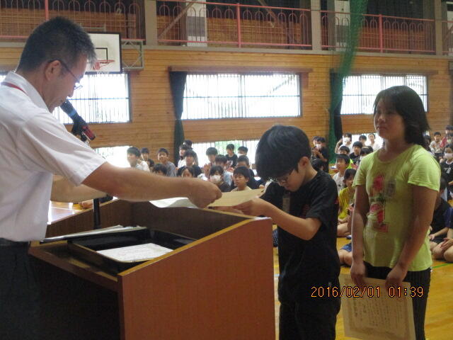 そこで、1学期の間、この「時を守り、場を清め、礼を尽くす」を特にがんばっていた人たちを担任の先生たちから推薦してもらい、終業式で校長先生から表彰してもらいました。「時」「場」「礼」の3部門での表彰で、自分のこともがんばり、プラス1で、周りにも気配りをして、みんなでがんばろうという雰囲気をつくろうとしていたところが選ばれたポイントだったようです。