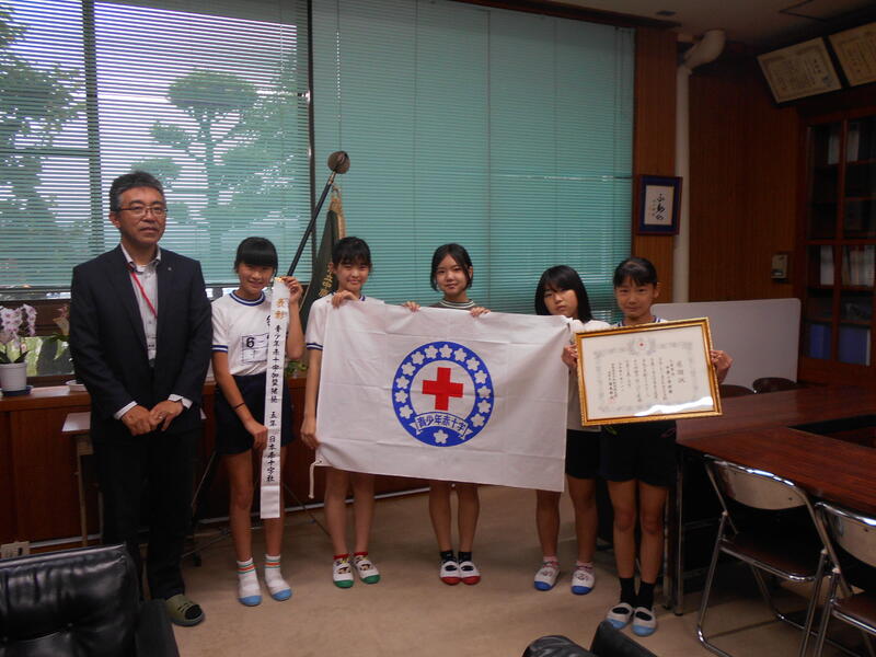 令和5年5月17日(水)熊本赤十字会館において、令和5年度熊本県青少年赤十字功労表彰伝達式が行われました。中原小学校は、赤十字活動継続5年以上の学校として、「日本赤十字社熊本県支部長感謝状」をいただきました。(写真は、感謝状を手にするJRC委員会6年生)