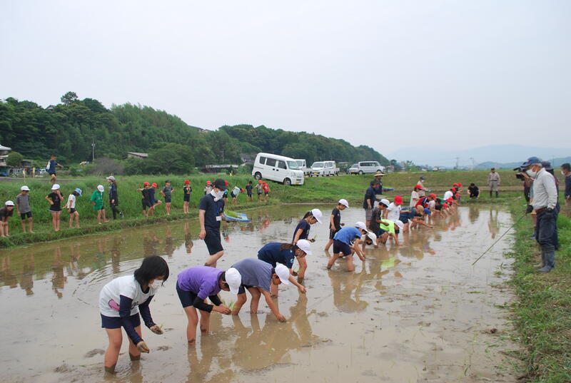 田植え体験学習 投稿日時 : 2022/06/13 学校サイト管理者 6月10日(金)に田植え体験を行いました。初めて体験する児童も多く、泥の中に入り、思わず尻もちをつく様子も見られました。ご指導いただいた方からは、「農作物は足音が分かる」という話をしていただき、愛情をもって育ててほしいと言われました。20日(月)には、アイガモ放鳥を予定しております。稲もアイガモも愛情をもって、みんなで育てていきたいと思います。