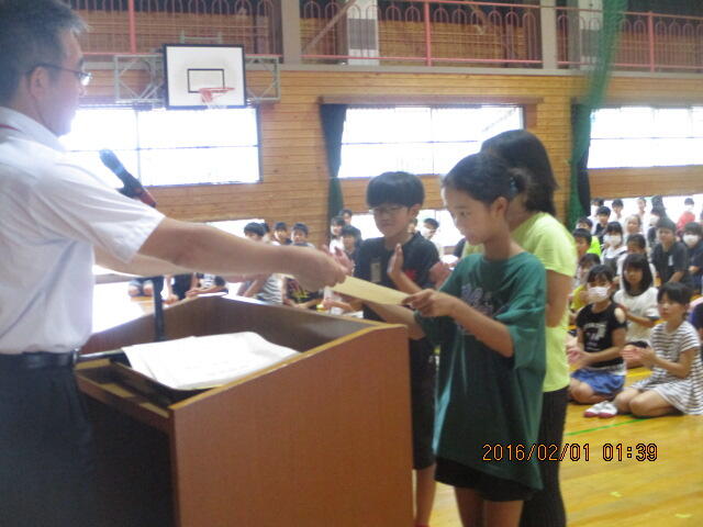 そこで、1学期の間、この「時を守り、場を清め、礼を尽くす」を特にがんばっていた人たちを担任の先生たちから推薦してもらい、終業式で校長先生から表彰してもらいました。「時」「場」「礼」の3部門での表彰で、自分のこともがんばり、プラス1で、周りにも気配りをして、みんなでがんばろうという雰囲気をつくろうとしていたところが選ばれたポイントだったようです。
