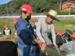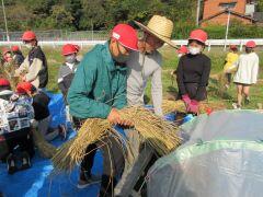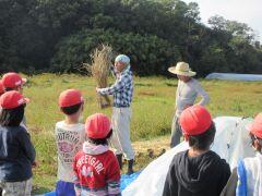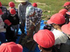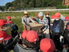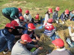 地域の方に教えてもらいながら、道具を使って脱穀を行いました。作業を行いながら、米作りのたいへんさを体感した子どもたちでした。
