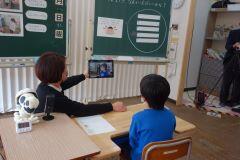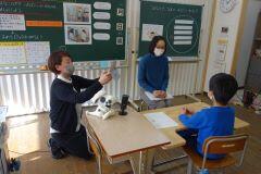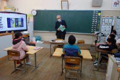 上共同調理場から渡邉先生に来ていただき、給食集会をしました。寒波のため、今回は6年生教室を主会場にリモートでの集会に変更しました。
