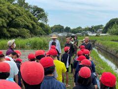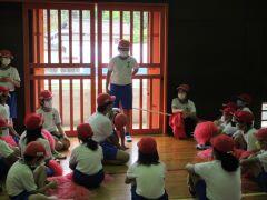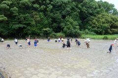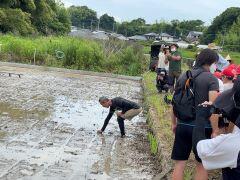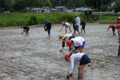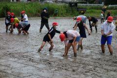 3年生から6年生は、地域の方の協力のもと、田植え体験を行いました。まずは、あいさつ、そして説明を聞きました。