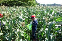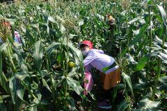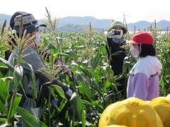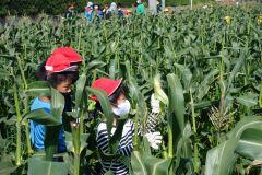 広い畑で、おいしそうなとうもろこしを探し、収穫しました。