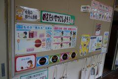 保健室前の掲示物も「目」に関することが掲示してあり、目を大切にしようとする意識付けを行っています。