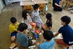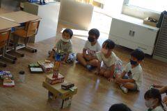 算数で、いろいろなかたちの箱がおいてあり、グループ毎に、箱の特徴をつかみながら、上手にきりんを作ることができました。