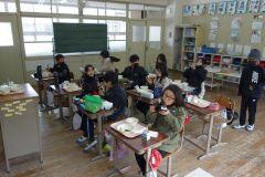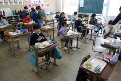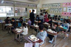 給食週間で今日は天草の味。献立は、あおさの味噌汁やきびなごのからあげ、たこときゅうりのすのものでした。