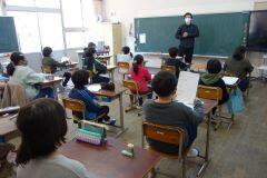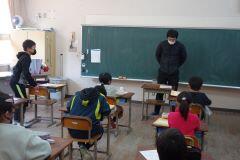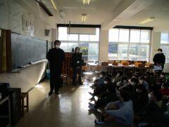 避難訓練に引き続き、上天草警察署の方に授業に入っていただき、警察の仕事について話を聞きました。