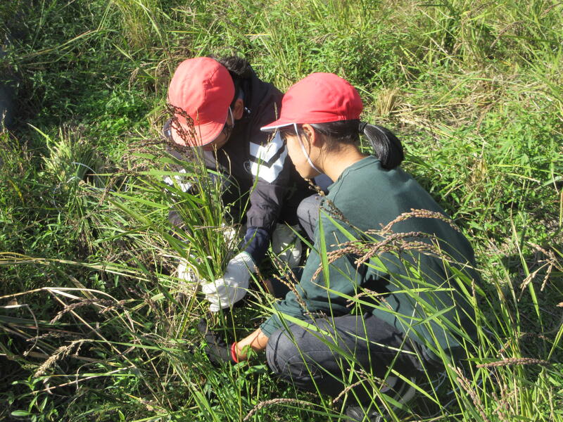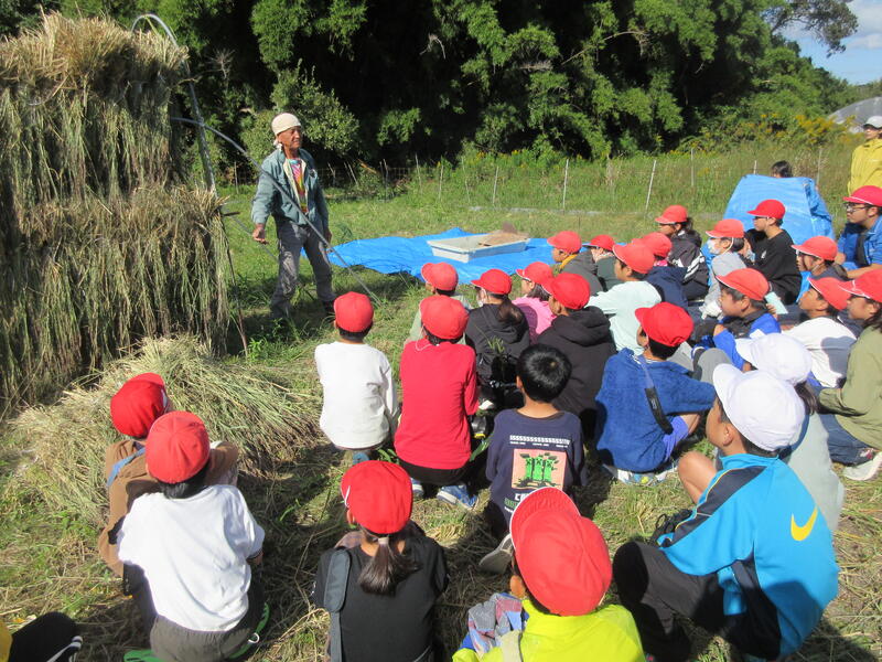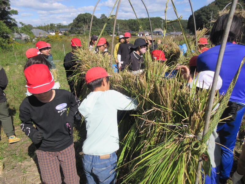 6月下旬、地域の平山様のご指導のもとで、古代種の一種である「緑米」の田植えを行いました。あれから約4か月、4~6年生は、自然栽培で育った稲刈り等を体験しました。鎌で稲を切る感触、かけ干しの作業、竹の箸や千歯扱き、脱穀機などで米粒を脱穀する感覚など。短い時間でしたが、平山様の丁寧な準備のおかげで、米収穫に関する一連の活動を体験することができました。人の手による米作りの大変さなどをしっかり学ぶことができました。