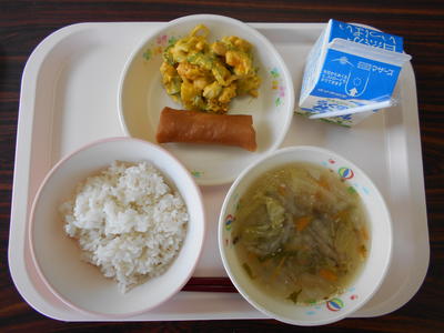 麦ご飯 牛乳 はくさいのジンジャースープ かぼちゃのサラダ はるまき
