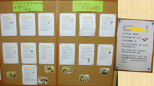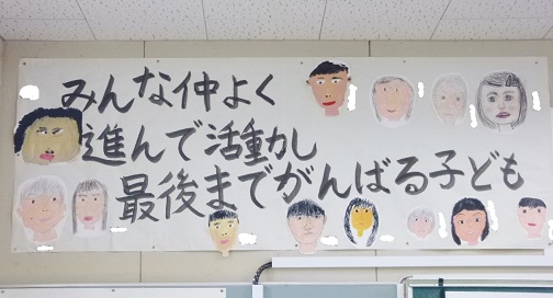 いつも笑顔いっぱい4年生の学級目標を紹介します。今年は学級目標をみんなで話合って決めました。「こんなクラスにしたい」と沢山出た意見をまとめてこの目標にしました。(※学級目標の文字は4年生のKさんが書きました。)今年から高学年の仲間入りをした4年生の更なる頑張りを期待しています☆☆