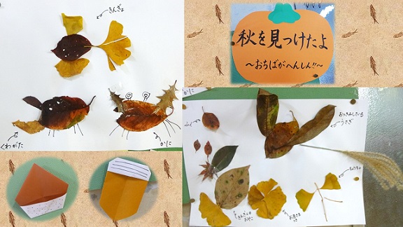 さくら学級の教室の前で素敵な作品を発見しました。落ち葉がいろんな形に変身しています。