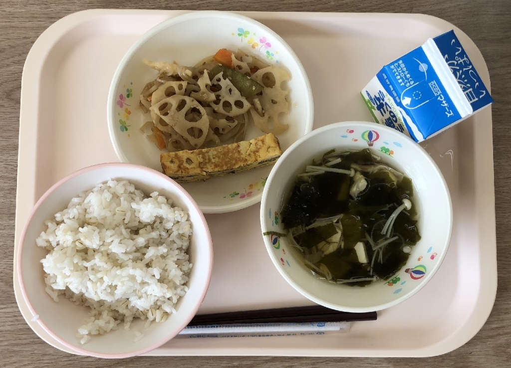 納豆に含まれる納豆菌には、タンパク質の吸収促進、血栓を予防する効果があるそうです。今日はいかの入った酢味噌あえもあり、よくかんで、しっかり満腹感を感じられた給食でした。