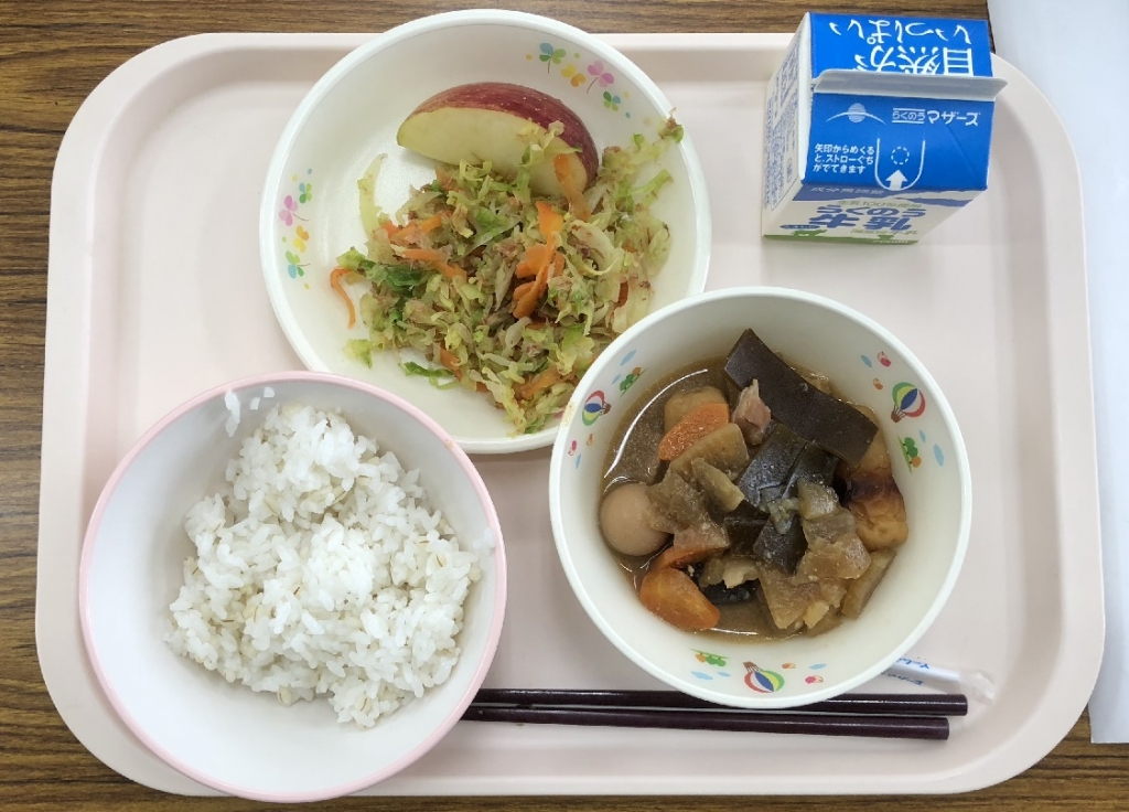 今日は、寒い時期にぴったりの「みそおでん」です。しょうゆ味のおでんと比べると、味わいが農耕で、体の中から温まります。給食のおでんは、かつお節とこんぶでだしをとり、赤みそと米みその2種類を使い、赤みその割合を多くして味に深みが出るようにしているそうです。まだまだ寒い日が続きますが、あたたかいものを食べて元気に過ごしてくださいね。