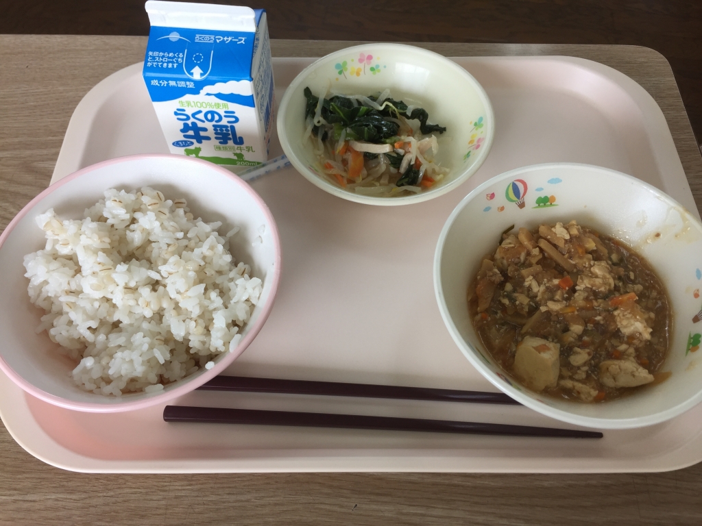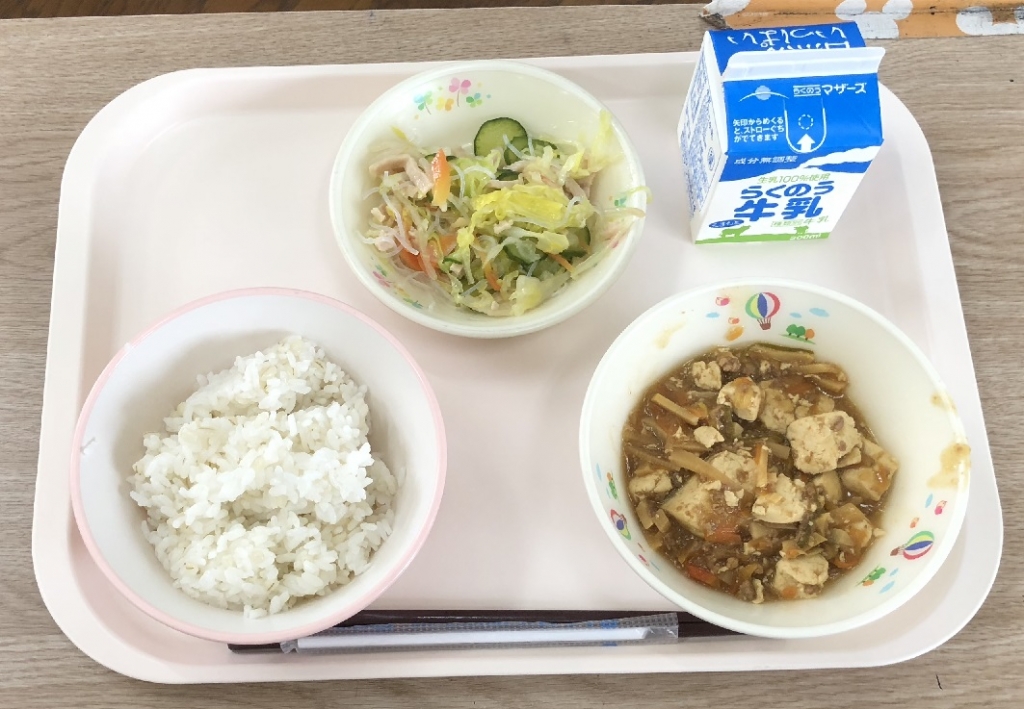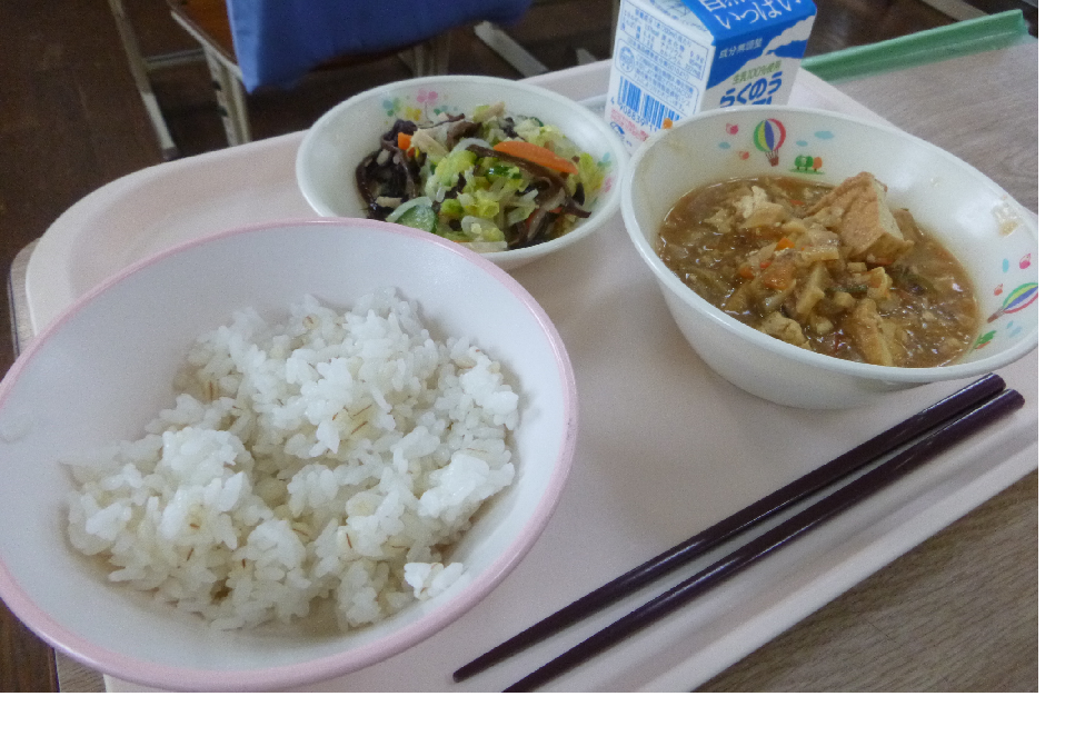 今日の給食は、とうふたっぷりのマーボー豆腐でした。豆腐には、大豆のおいしさと栄養がギュッと凝縮されています。大豆から豆腐になることで大豆に含まれる栄養素の消化、吸収がよくなります。