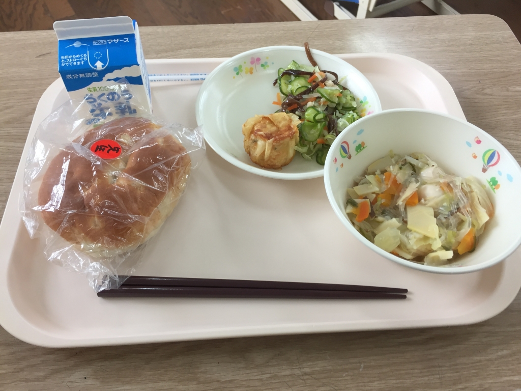 今日は中華風の給食です。バンサンスーはもともと中国料理で、「バン」は「あえる」、「サン」は数字の3、「スー」は「糸のように細く、せん切りにする」という意味があります。給食では、春雨、細く切ったハム、にんじん・きゃべつ・もやし・きゅうりを、さまざまな調味料で和えて作ってあります。ツルツルとした食感も春雨のおいしさのひとつ。野菜のシャキシャキ感とあわせて、おいしく食べましょう。
