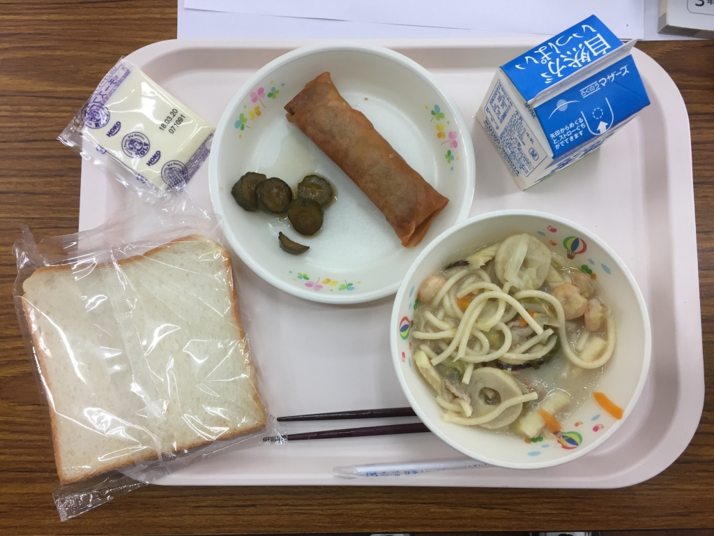 チャンポンは長崎県の郷土料理です。今から100年以上も前に長崎県の中華料理屋で安くて栄養のある食べ物を中国の学生に作ったものが「チャンポン」と言われています。給食では、作ってから食べるまでに少々時間があるために麺が伸びないようにスパゲッティーの麺を使用しています。今日は冷え込んで、温かいスープがありがたい1日でした。中華麺ではありませんが、ひと味違うチャンポンを味わいました。