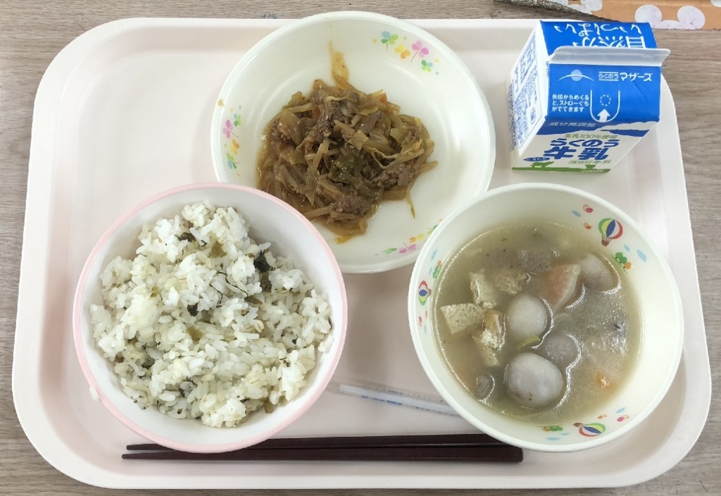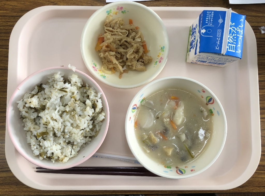 高菜は九州地方の名産品ですが、阿蘇地方でしか育成されない阿蘇高菜は、収穫量も少なくとても貴重だそうです。今日の給食には、阿蘇高菜がふんだんに使われています。3年生も食べているときに「ふるさとの味がして美味しい」と、とても喜んで食べていました。阿蘇の味がこれからもずっと続くといいですね。