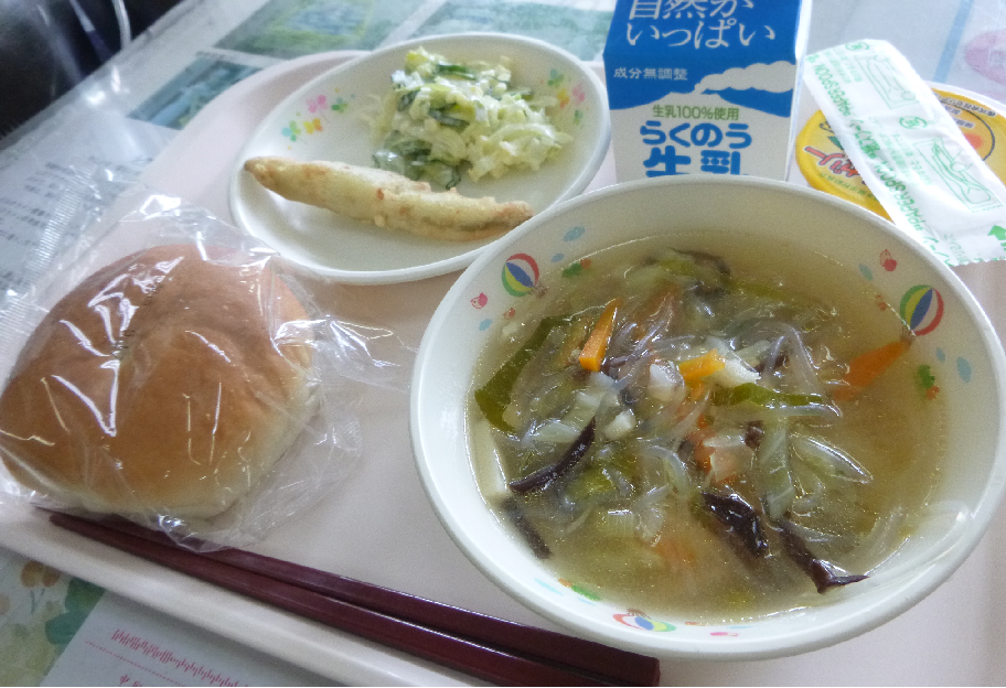 今日は「ふるさとくまさんデー」の給食でした。大きいおかずの「太平燕」。もともとは中華料理ですが、日本でアレンジをされた料理ということです。熊本は特に有名ですよね。また、今日はデザートに、ばんかんゼリーも登場しました。暑い日にはぴったりの涼しげなデザートで子どもたちも大喜びでした。