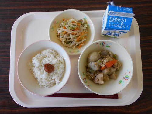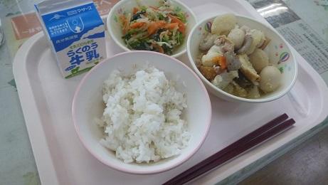 牛乳 麦ご飯 いかと里芋のにもの もやしのカレー和え