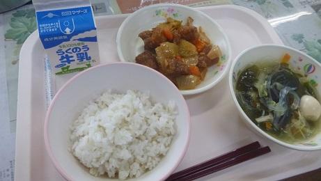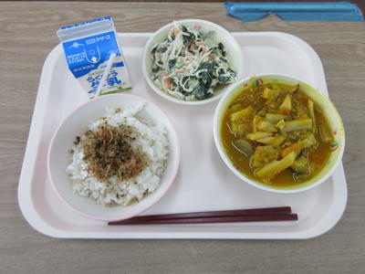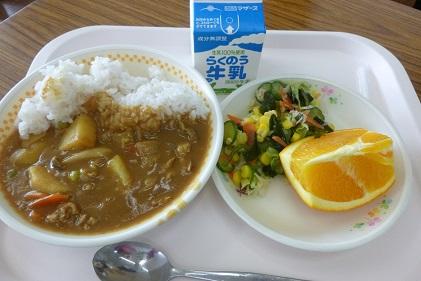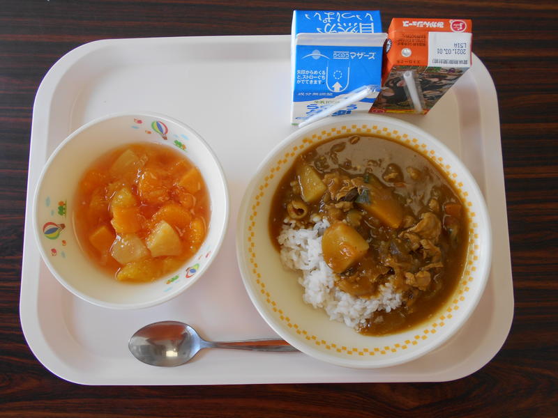 今日は、給食で人気のカレーライスでした。じゃがいも、にんじん、玉ねぎをたくさん入れています。かくし味に、にんにく、しょうが、フルーツチャツネ、チーズ、しょうゆ、ソース、カレー粉が入っているそうです。