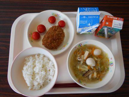 牛乳 食パン 白菜のジンジャースープ カロテンサラダ かぼちゃフライ デザート