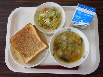 黒ごまきなこトースト 牛乳 野菜たっぷりスープ ビーンズサラダ