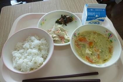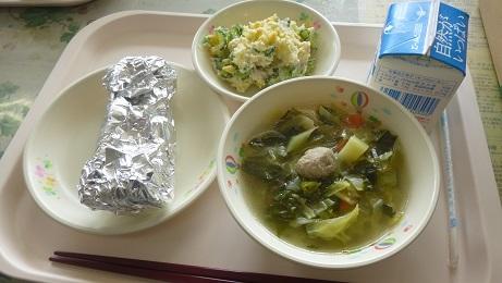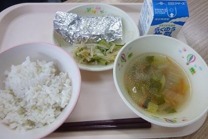 麦ご飯 牛乳 はくさいのジンジャースープ かぼちゃのサラダ はるまき