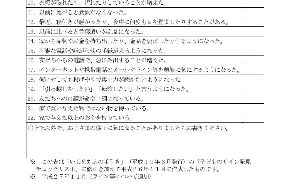 いよいよ冬休みに入ります。冬休みはお子さんと過ごす時間が増える期間です。このチェックリストを利用し、お子さんの様子を観察してください。何か気になることがありましたら、お気軽に学校までご連絡ください。