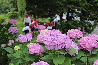 有名な一心行の大桜を校区に持つ中松小。6月、グラウンドの脇にはアジサイが咲いています。中松小の梅雨の楽しみの一つです☆