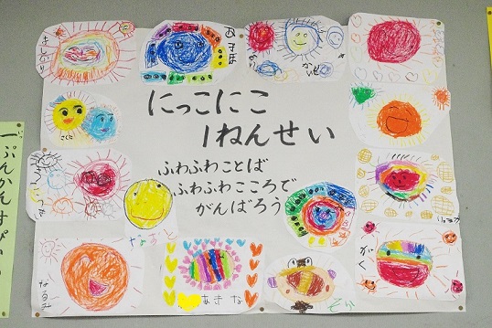 4月、入学後1年生が小学校ではじめて書いた『太陽』の絵です。にっこにこのあったかい太陽が1年生を見守っています♫