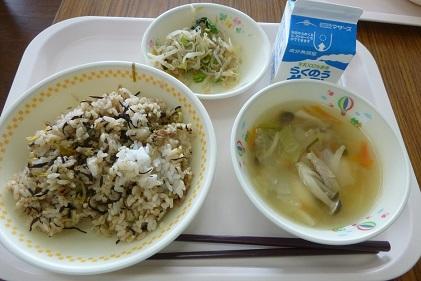 今日のご飯は、むぎごはんではなく、ごはん。いつもとは違う精米方法の「お米」を炊いています。いつもよりお米の精米時間を短くして「7分づき」くらいのお米です。栄養面では、ビタミンB、ビタミンE、あえんなどの栄養が多くなり、お腹の調子もよくなるそうです。