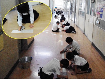 いつもは登校後、元気いっぱい外で遊んでいる子ども達ですが、この日は「クリーン作戦」!朝からみんなで廊下の白線みがきをしました☆「ふ~~」と、指をマッサージしながらきゅっきゅっと頑張ってみがいていました。みんなの頑張りで学校がピカピカになりました♫