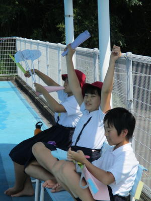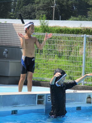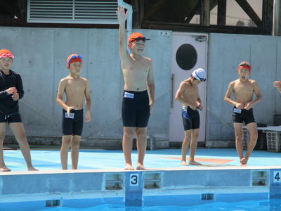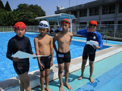 担任の先生が一人ひとり、どんな自由な泳ぎをするのかインタビューもされました。すると、「犬かきで泳ぎます」とか「手は平泳ぎ、足はバタ足で泳ぎます」とか「手は背泳ぎで足は平泳ぎで泳ぎます」などそれぞれがユニークな泳ぎを披露し、周りを楽しませくれました^^!