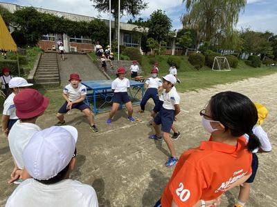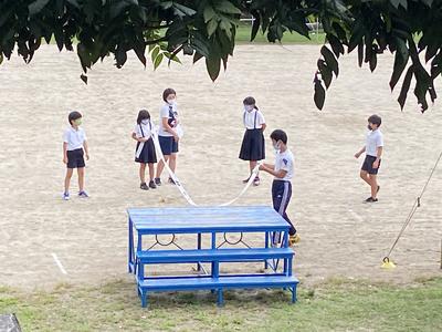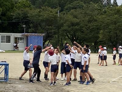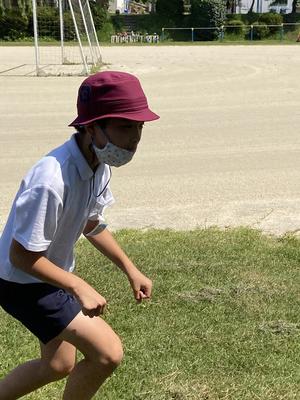 6年生が次々と終わった子の手に消毒薬をかけてくれました。しかし、順調にリレーが進んでいく途中、大きい雨粒が落ちてきました。4~6班の子どもたちは1~3班の応援をしていたのですが、雨が激しくなりそうだったので担当の先生が「4~6班の子どもたちは教室に戻って!」と、言うと・・・。これが最後のハプニング