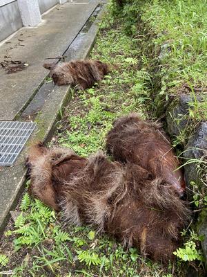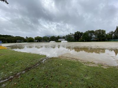 上の写真は、今日の午前11時過ぎの運動場の写真です。運動場北側にどうしても水が溜まってしまうので溝を掘って1時間近くたってこの状態でした。果たして、明日、運動会はできるのだろうか・・・。グランドがこんな状態で、朝から準備して7時45分に始められるのだろうか・・・と不安ばかりが募ります。