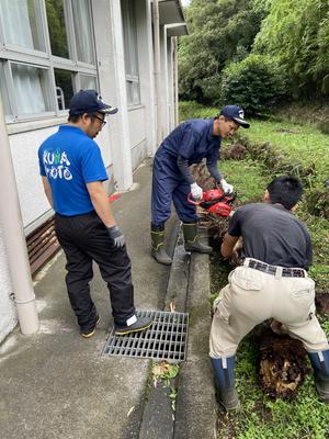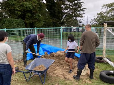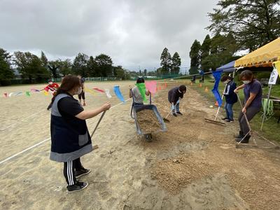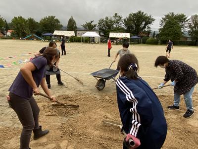 午前中は池のようだった運動場が見事によみがえりました^^!グランド整備の後は、地区ごとにテント立て!