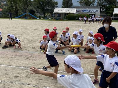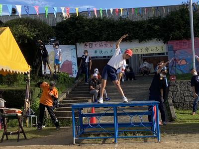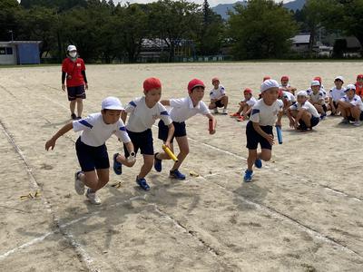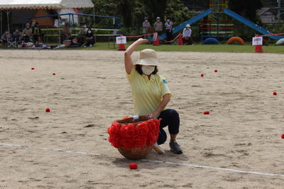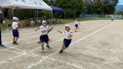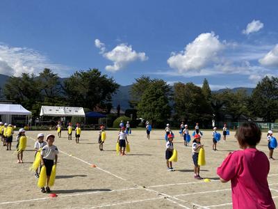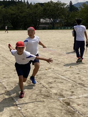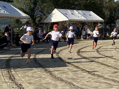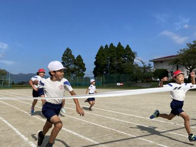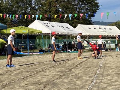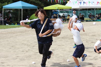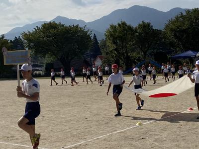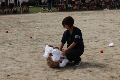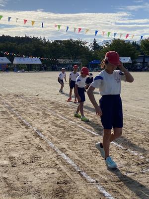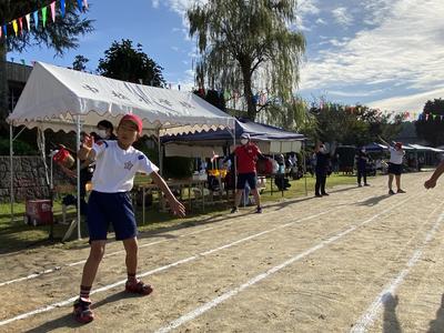 写真をとっていませんが、この他、低学年の紅白玉入れ、中学年の台風の目、高学年の親子技巧走がありました。そして最後の種目、全員リレーで競技終了。