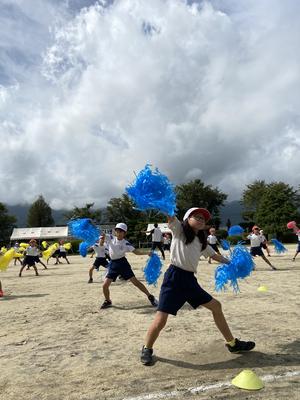 低学年のダンス、青空に色とりどりのボンボンが映えます。踊りも可愛らしく完璧!!!
