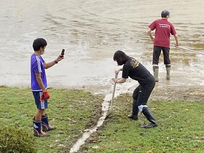 その後も、外庭掃除の子どもたちとスポンジで水を吸い取ったり、一関の幹事長さんが一緒にトンボで泥をすくい取ったりして下さいました^^!