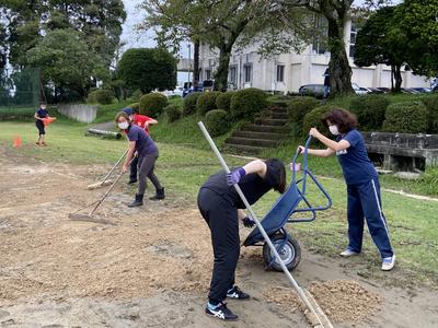 私が、現場を離れいてる隙に新たな助っ人が用水路を延長してくれていました。校長先生、養護の先生、理科専科の教務の先生は、理科の学習に使えると流れる水を動画撮影しておりました^^!