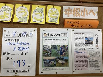 校長室の横の掲示板には、閉校まであと193日のカウントダウンが。いよいよ中松小最後の運動会;  ;。