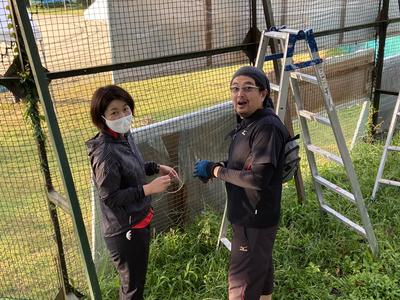 スローガンをバックネットに付けている所で職員に集合がかかると、後は松の木の保護者の方々が付けて下さいました^_^!