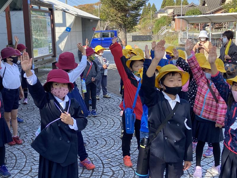 今日の業間に児童玄関前に集合し、トロッコお姉さんの見送りを受けながら10時30分に学校出発!